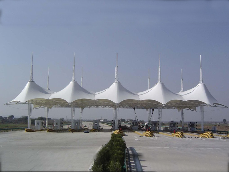 出入口膜結(jié)構(gòu)是采用膜與鋼結(jié)構(gòu)的一種結(jié)合呈現(xiàn)出的新形出入口的一種新形建筑,膜材料是指聚酯纖維基布或PVDF、PVF、PTFE等不同的表面涂層,配以優(yōu)質(zhì)的PVC組成的具有穩(wěn)定的形態(tài),并可承受一定載荷的建筑紡織品。它的壽命因不同的表面涂層而異,一般可達(dá)成10-20年;其外觀整潔大方,自潔性強(qiáng)。主要應(yīng)用于各大出入口,收費(fèi)站等場所。
